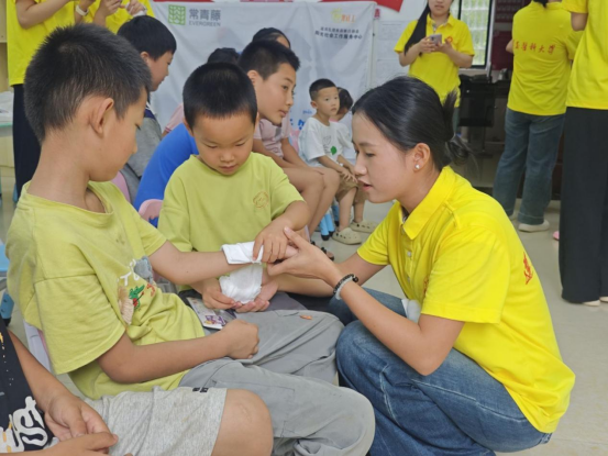 实践队采取“理论+实操”的形式展开止血包扎、海姆立克急救法及心肺复苏(CPR)三大模块的急救技能培训。结合多媒体与实物道具,教授压迫止血、绷带的使用方法,利用动画视频进行卡喉情境演示,分年龄段讲解适用手法,运用口诀“剪刀石头布”帮助记忆。从判断意识、呼救到胸外按压、人工呼吸全流程讲解,并引导孩子们操作,志愿者现场指导与纠正。