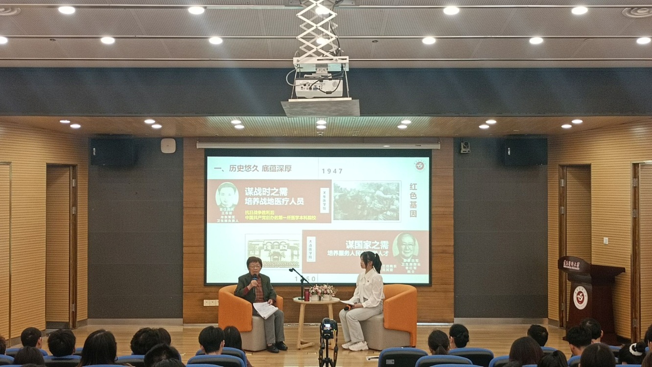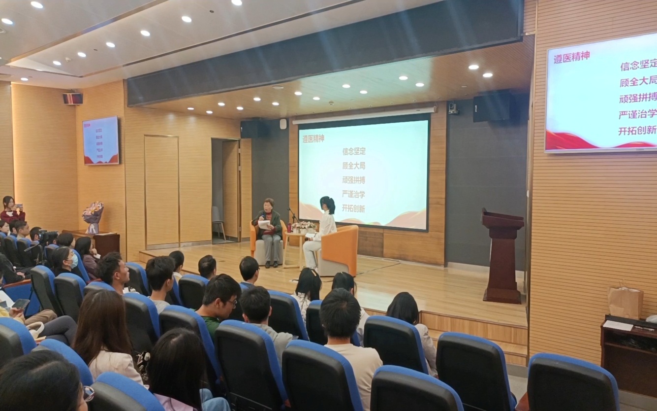 第二阶段,师生们来到图书馆一号报告厅,公司关工委钱民章教授与员工代表朱学睿同学以访谈形式为师生们讲述遵医精神。钱民章教授详细阐述了遵医精神的内涵、来源以及在公司发展中的作用,并以个人求学及工作经历讲述遵医精神对她人生的影响。员工代表朱学睿同学讲述自己感受到的“遵医精神”:公司自大连南迁遵义的历史,反映了老一辈遵医人“信念坚定、顾全大局”的精神,课堂上认真授课的教师、实验室里埋头专研的导师,公司更名、申博取得的一项项成果,反映了一代代遵医人“顽强拼搏、严谨治学、开拓创新”的精神。最后,钱民章教授讲述了新一代遵医学子学习“遵医精神”的意义:一是帮助师生树立正确的人生观、价值观,要坚定理想信念,有大局意识,为国家和社会做有意义的事情;二是帮助师生树立正确的生活态度,人生不都是坦途,要积极乐观,顽强拼搏;三是帮助师生树立正确的工作、学习态度,应该在服务社会和实现自我价值中享受人生。 “信念坚定、顾全大局、顽强拼搏、严谨治学、开拓创新”的遵医精神,它体现了公司的办学历史,是公司的“魂”,更是刻在无数遵医人心底的行为理念。